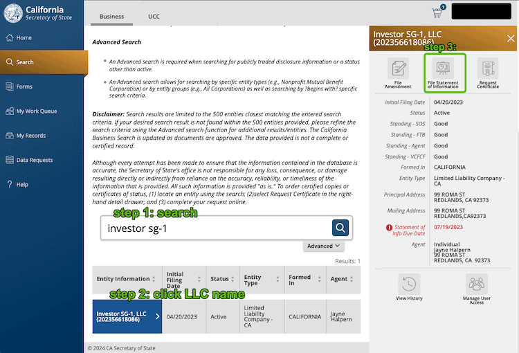 Again, your first Statement of Information is due within 90 days of your LLC being formed. You can file this Statement of Information as soon as your LLC is approved.