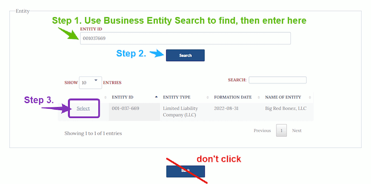 Click the link “Select” next to your LLC’s record. (Don’t click the big “Back” button at the bottom of the page).