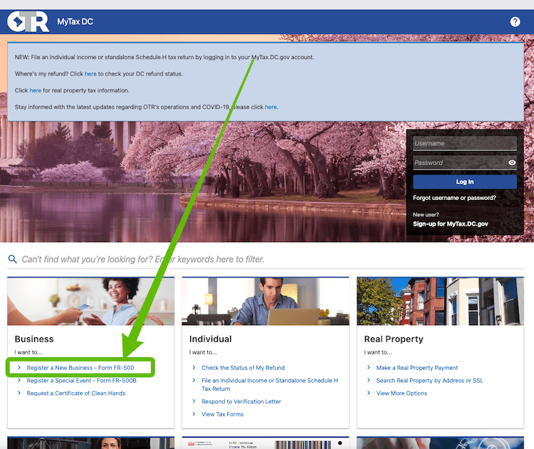 Get started: Go to the MyTax homepage and click “Register a New Business: Form FR-500” (it’s in the middle of the page).