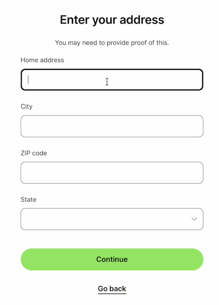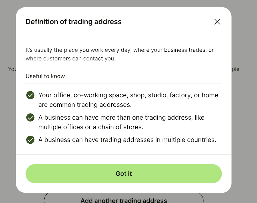 You’ll also enter your “trading address”. This is where you work. This can be in the US or in any country. It can be a home address or office address. It can also be a co-working space, shop, studio, or factory.