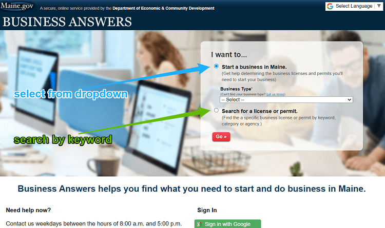 The Maine Department of Economics and Community Development created a service called Business Answers to help people start businesses in Maine. Their website has two ways to search for business license requirements: by selecting your business type from a list, or searching by keyword.